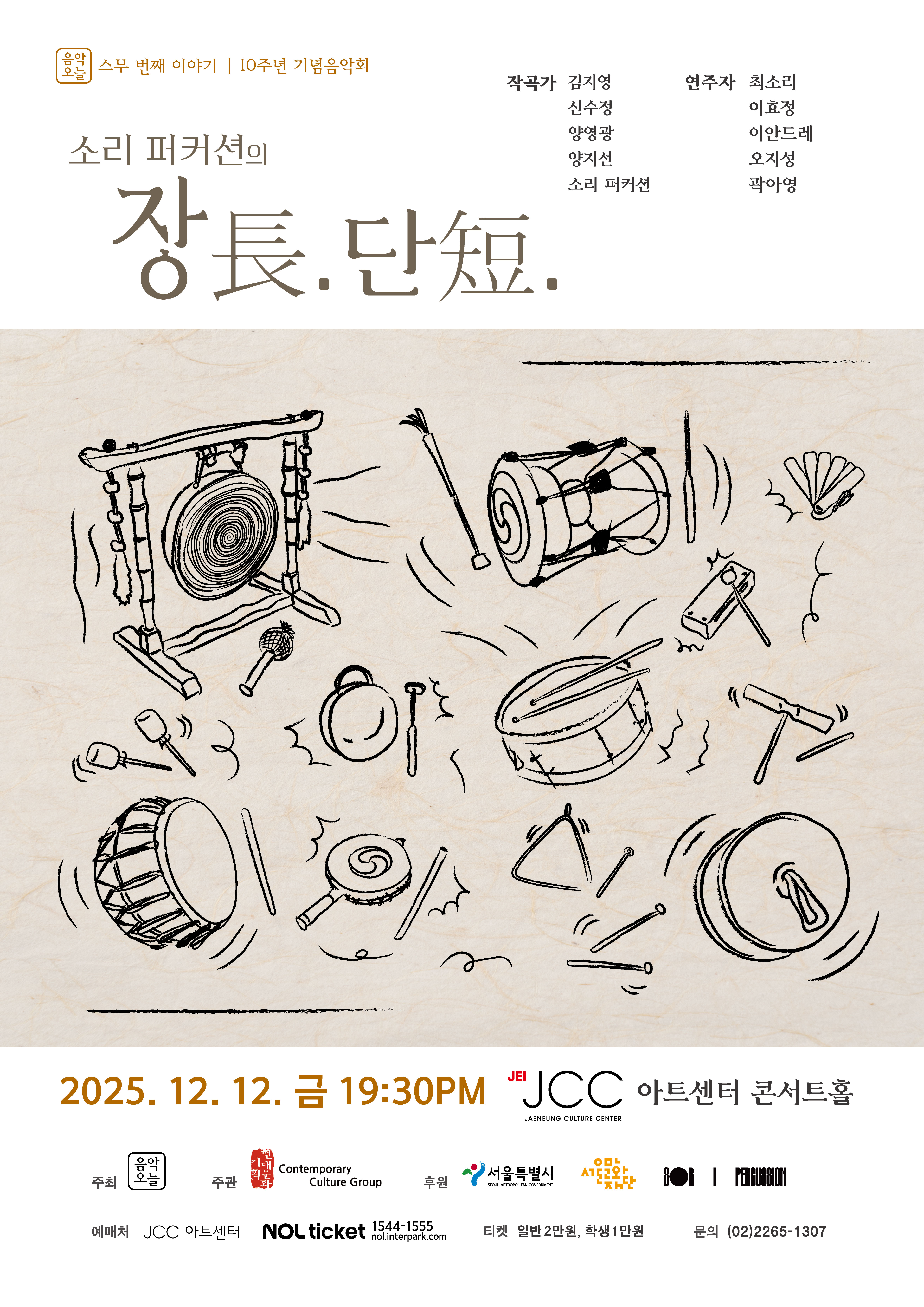 - 타악기는 우리가 삶에서 가장 먼저 만나는 악기입니다. ‘음악오늘’은 타악 음악 연속 기획을 통해 2023년 〈작은 타악〉, 2024년 〈북.채.통!〉을 무대에 올렸습니다. 이번 프로젝트는 그 연속 기획의 마지막이자, ‘음악오늘’ 10주년의 의미를 담아 타악 연주 전문 그룹 소리 퍼커션(SORI Percussion)과 함께 준비한 연주회 〈장長.단短.〉입니다. 전통 타악기와 현대 타악기의 융합을 통해 새롭게 확장된 예술적 표현을 경험할 수 있습니다. ‘장단’은 문자 그대로 ‘길고 짧음’을 뜻하며, 고유한 패턴과 구조를 지닌 개념입니다. 서양 음악의 ‘리듬’은 음가의 분할과 반복을 중심으로 이루어지는데, 두 개념은 출발점은 다르지만 본질적으로 유사성을 공유합니다. 이번 연주회에서는 전통 타악기와 서양 타악기의 공통분모인 ‘리듬’을 바탕으로 새로운 예술적 표현을 탐구한 작품들을 만나보실 수 있습니다. 여러분을 리듬의 현장으로 초대합니다.
